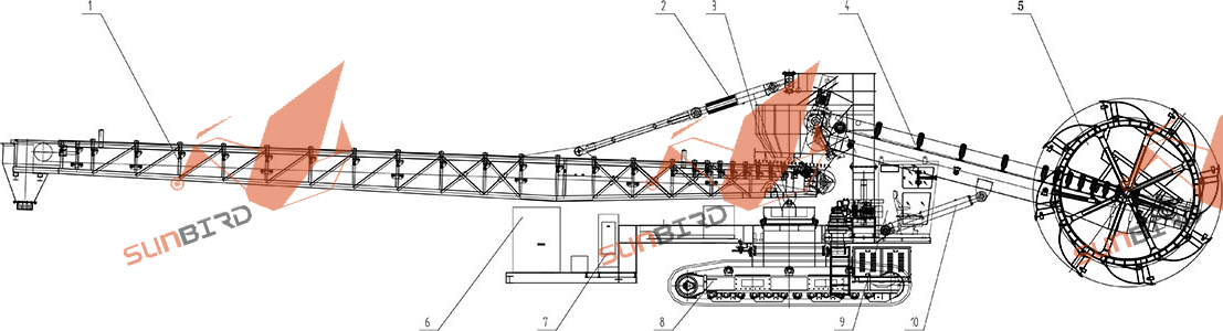 1. 卸料皮帶機、2.卸料皮帶機俯仰油缸、3.主機結構、4.取料皮帶機、5.斗輪機構、6.柴油發電機組、7.電控柜、8.履帶行走、9司機室、10.取料皮帶機俯仰油缸
